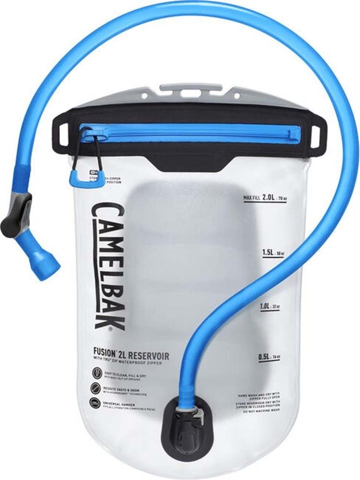 Who better than CamelBak to introduce the latest technology in trail-ready reservoirs? After all, we invented them! Our new Fusion 2L Reservoir with TRU® Zip Waterproof Zipper delivers innovative hydration solutions so you can keep your mind on the journey ahead. An integrated handle and pinch grip construction allows for comfortable and easy single-handed filling at sinks and refrigerators. Hydration for running, hiking and biking, wherever you may roam. We create ever-evolving hydration systems that keep up with our always-exploring adventurers. The Fusion 2L Reservoir with TRU® Zip Waterproof Zipper offers revolutionary design that's easy to use. We bring heavyweight features in an ultralight package equipped with a universal hanger for all hydration-compatible packs. Molded backplate creates a thin profile with no need for baffles so cleaning is that much easier. Made with safer chemicals, earning the Repurpose Green Sustainability Badge. At journey's end, everyone will enjoy easier cleaning thanks to Hydroguard technology which inhibits the growth of bacteria in the reservoir and tube.