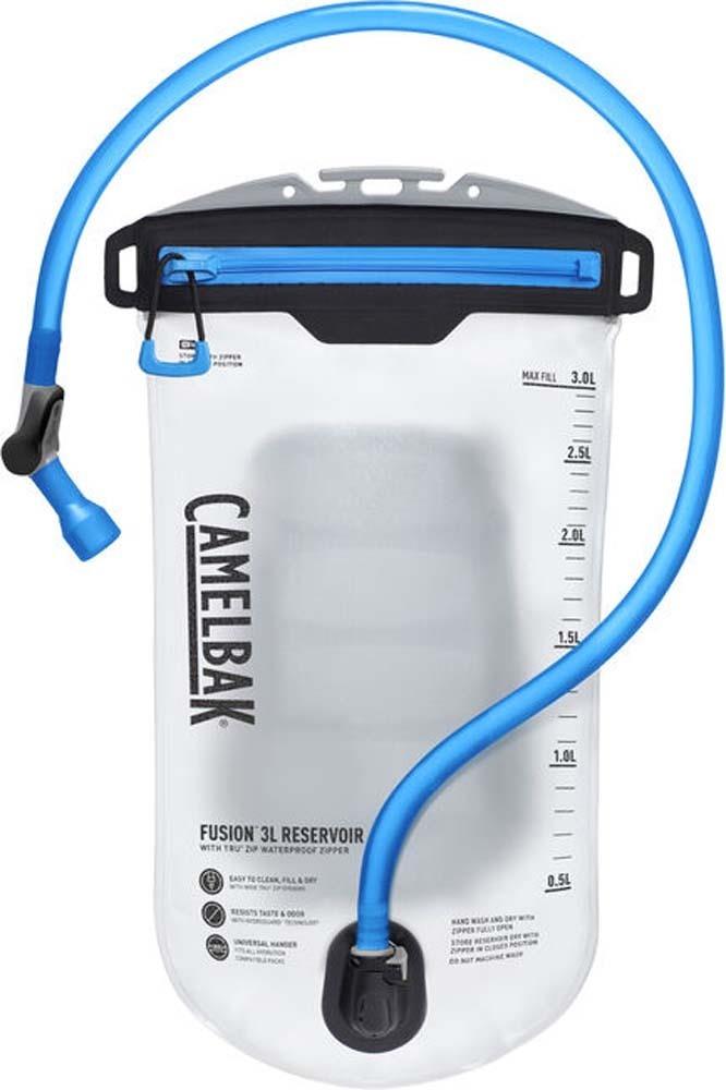 Keep calm and carry more with our new Fusion 3L Reservoir. This enhanced hydration solution lets you concentrate on the adventure at hand. Speaking of hands, our integrated handle and pinch grip construction allows for single-handed filling at sinks and refrigerators. TRU® Zip is durable and waterproof so zipping is remarkably simple. Finally, the universal hanger fits any of our hydration-compatible packs. A dynamic, integrated hydration solution created for hardcore runners, hikers and cyclist, the Fusion 3L Reservoir with TRU® Zip Waterproof Zipper is ready for the long haul. Enjoy convenient compatibility thanks to a universal hanger that will fit any hydration-compatible packs. Our Quicklink System ensures easy on-the-go reservoir removal from the pack. Keep it clean with Hydroguard technology to limit bacteria in the reservoir and tube. Even better, the rigid backplate eliminates need for baffle for easier cleaning and drying. Repurpose Green Sustainability Badge: Made with safer chemicals.
