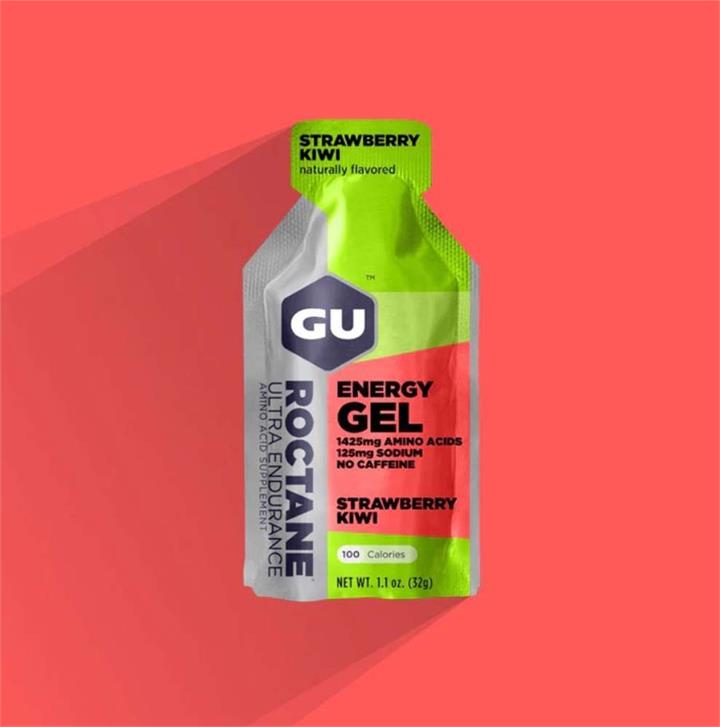 Strawberry Kiwi is that crisp, juicy flavor you crave in the summer. It's not only a perfect blend of kiwi and strawberry essences, but also the perfect blends of sweet and tart. Reach for it when you want to be transported to a tropical paradise during your next run, ride, or adventure. GU Roctane Energy Gels are crafted to supply both energy and key nutrients like electrolytes and amino acids to keep you feeling strong and energized. The precise blend of complex and simple carbohydrates will fuel you up, so you feel good, longer. Our huge variety of delicious flavors will save you from flavor fatigue, so you can stick to your nutrition plan and keep going. What's the ROCTANE difference? In short, ROCTANE Energy Gels are designed for long-duration and high-intensity activities, when you're trying to up your mileage or push yourself further. But what does that really mean? It means that ROCTANE Energy Gels are packed with up to three times as much sodium (depending on the flavor), and three times as many branched-chain amino acids as compared to our original Energy Gels. ROCTANE Energy Gels also have extra amino acids: Taurine can help maintain heart contractility and improve cardiac output during long exercise sessions and beta-alanine can help promote formation of the intramuscular buffer carnosine, which can help delay the onset of fatigue during high-intensity efforts.