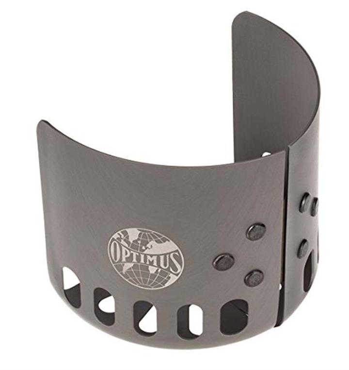 Lightweight, hard anodized aluminium clip-on windshield for use with canister mounted stoves. Increases stove efficiency and substantially reduces gas consumption. Fits every gas canister according to EN417 and pots with max. diameter 13 cm (5 in). Compatible with standard pots and high profile heat exchange pots. Easy packability (fits around the Optimus Terra Weekend HE pot).